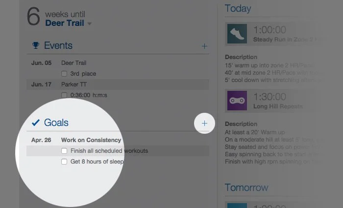 Adding a goal is a great way to stay on track! With our coaches. These goals are designed to be more process oriented, and can have a series of sub-goals under each main goal. Use these goals to stay on track over time. Add a goal by clicking on the plus sign next to the Goals title. All goals created in Home View will also be shown on your Calendar.