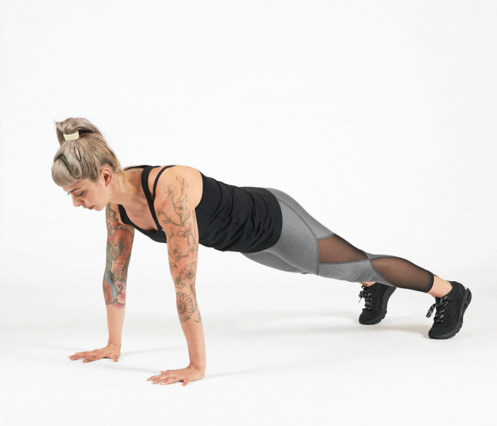 The move: Get in a pushup position with your hands about shoulder-width apart. Keep your lower back flat and don’t let your hips sag. Lower yourself and keep your elbows close to your body as you descend.